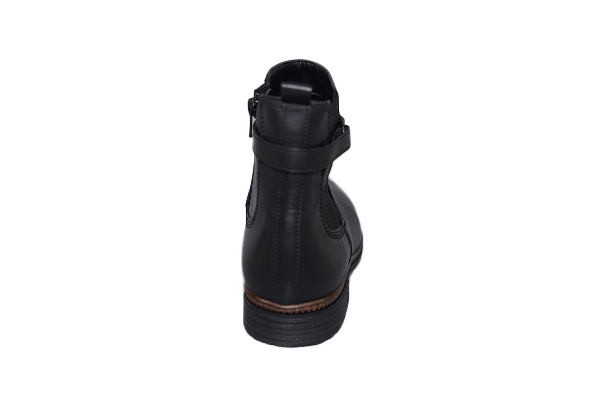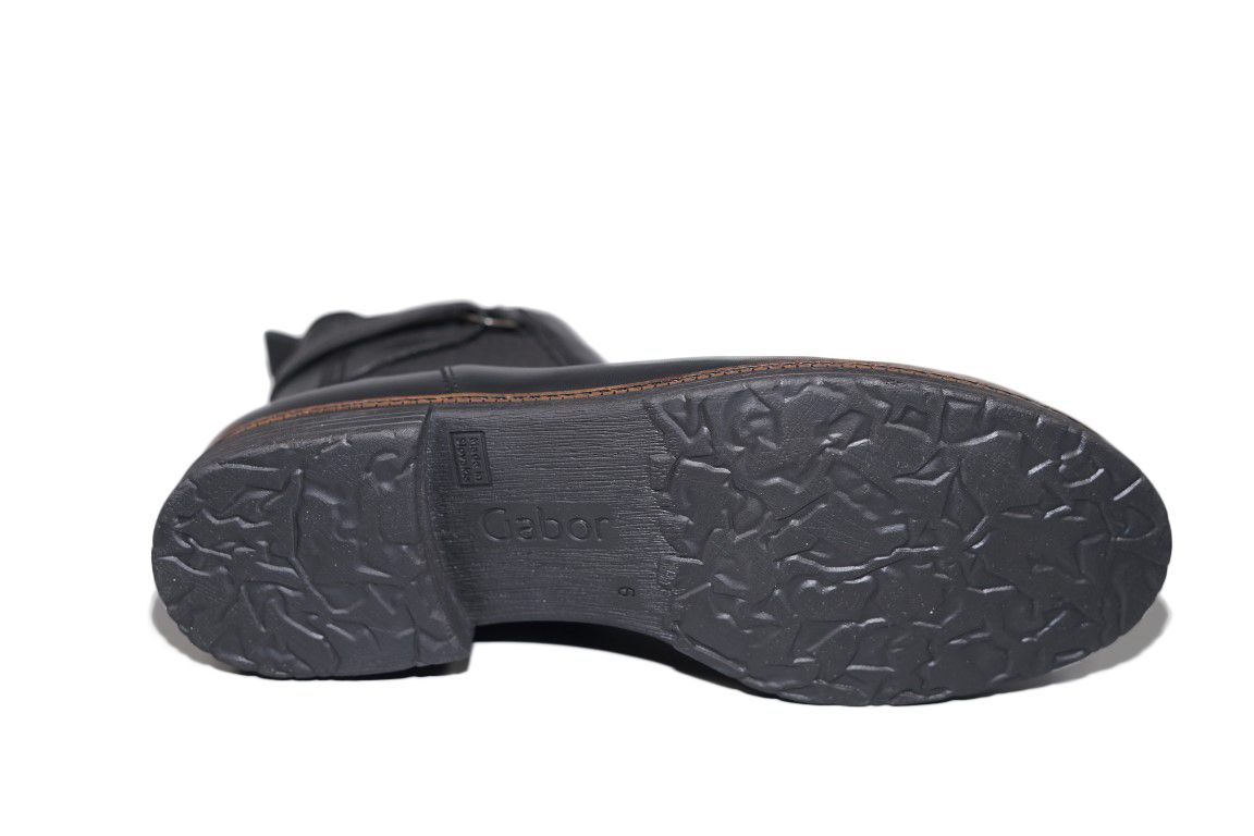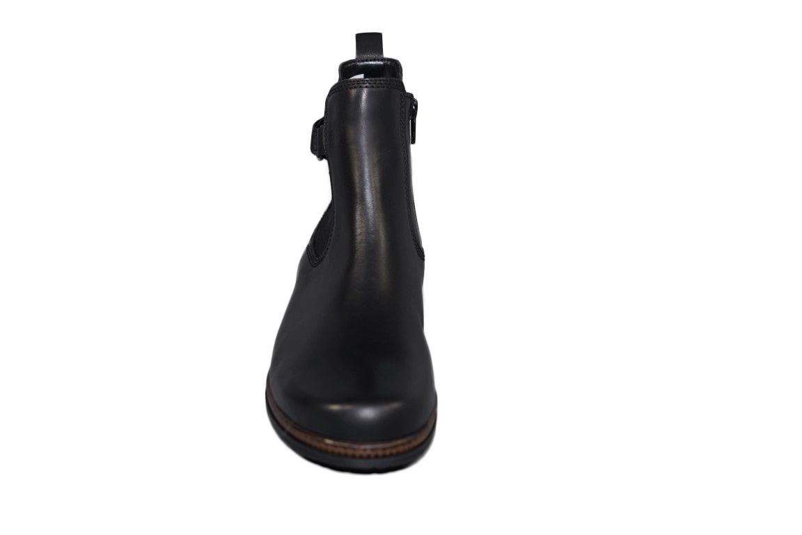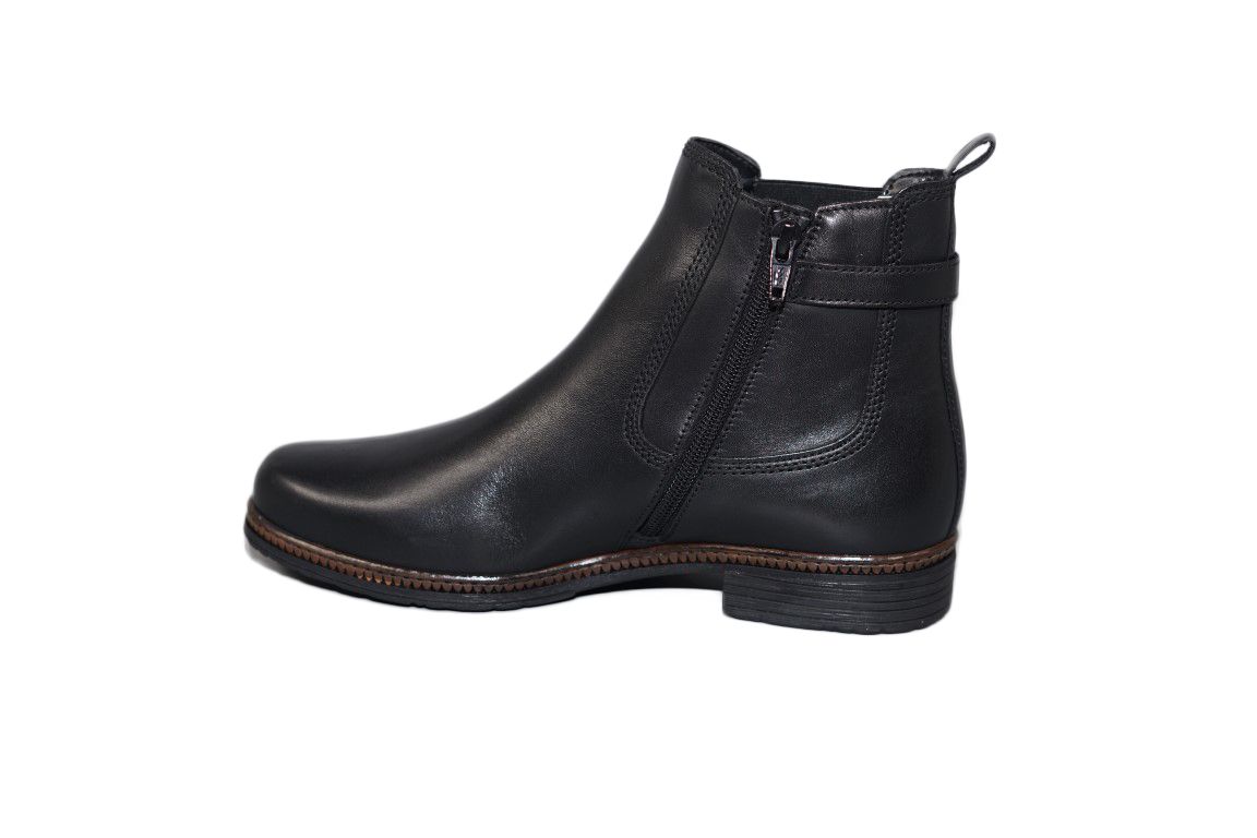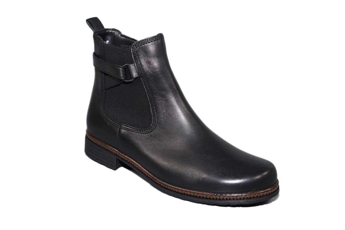 Fijne enkellaars van Gabor in zwart leer met elastiek en gespje op zachte zool.