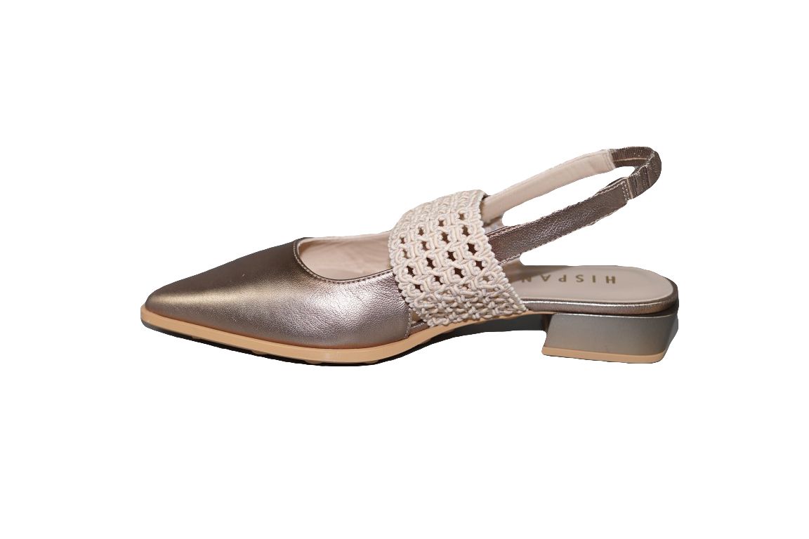 Fijne slingback van Hispantias in goud leer band over de wreef op kleine hak.