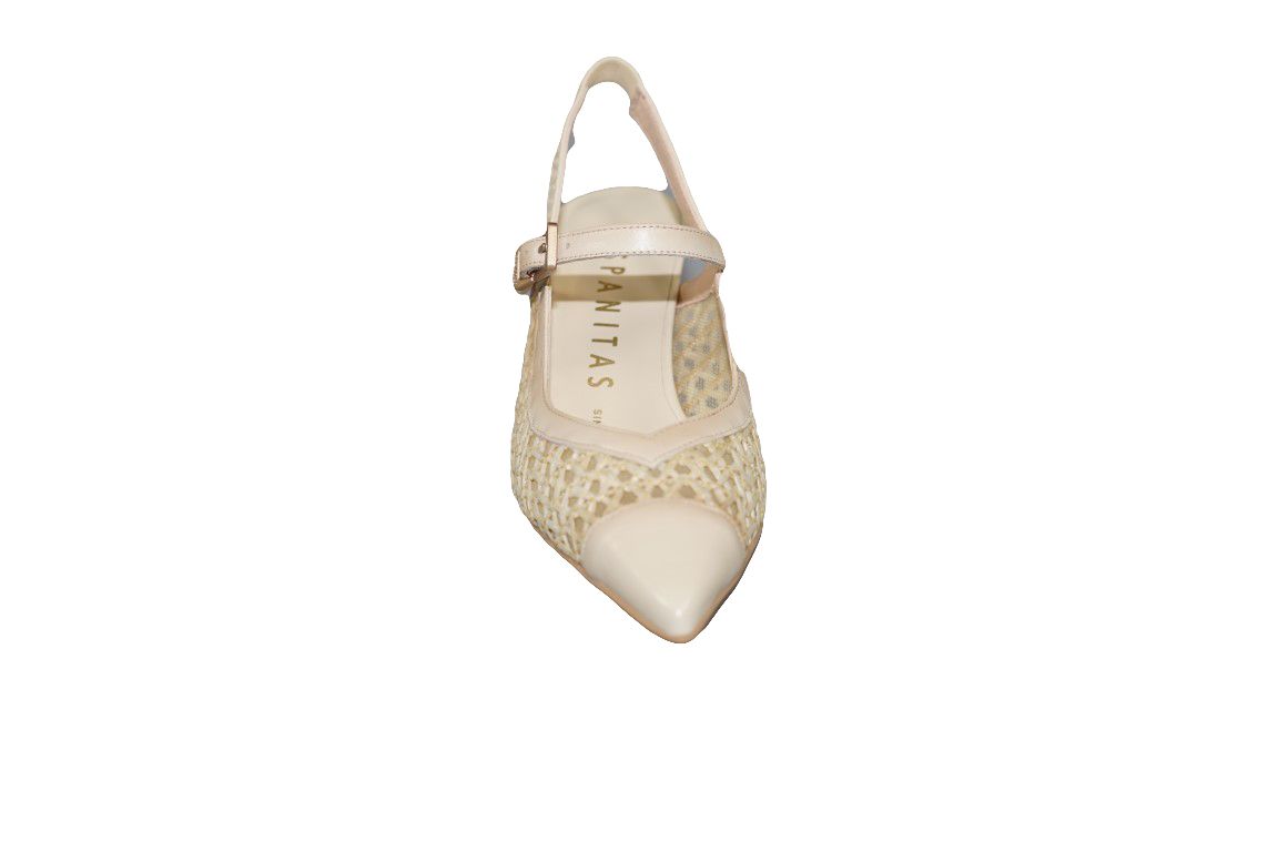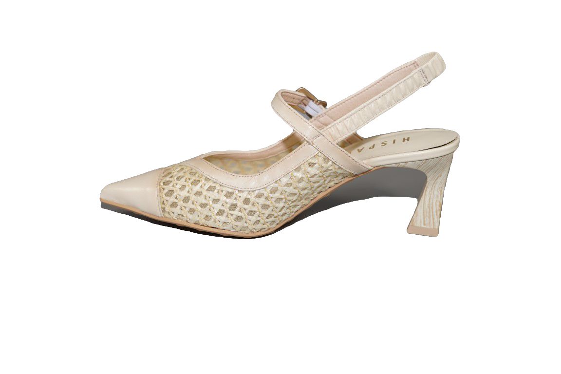 Fijne slingback van Hispantias in room wit met alcantara vlecht op hoge hak.
