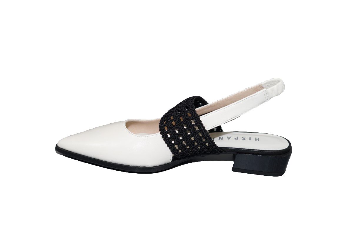 Fijne slingback van Hispantias in wit leer met zwarte band op kleine hak.