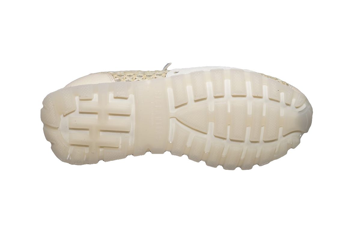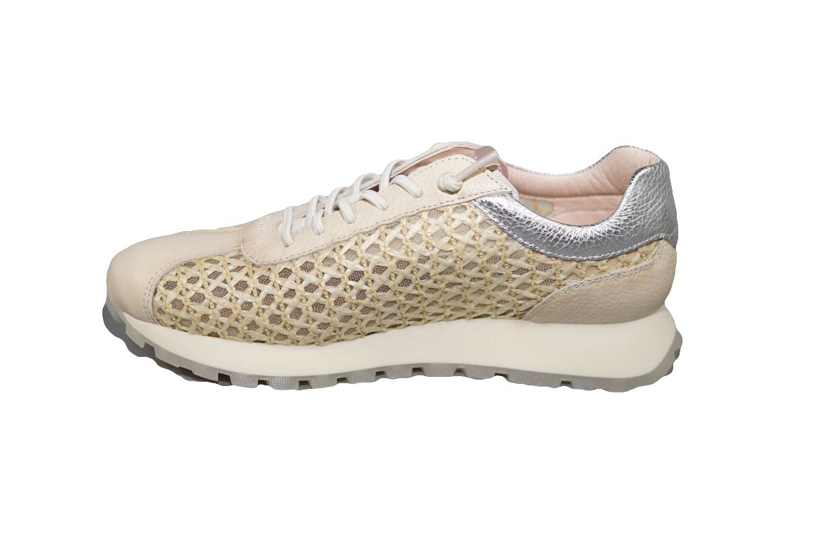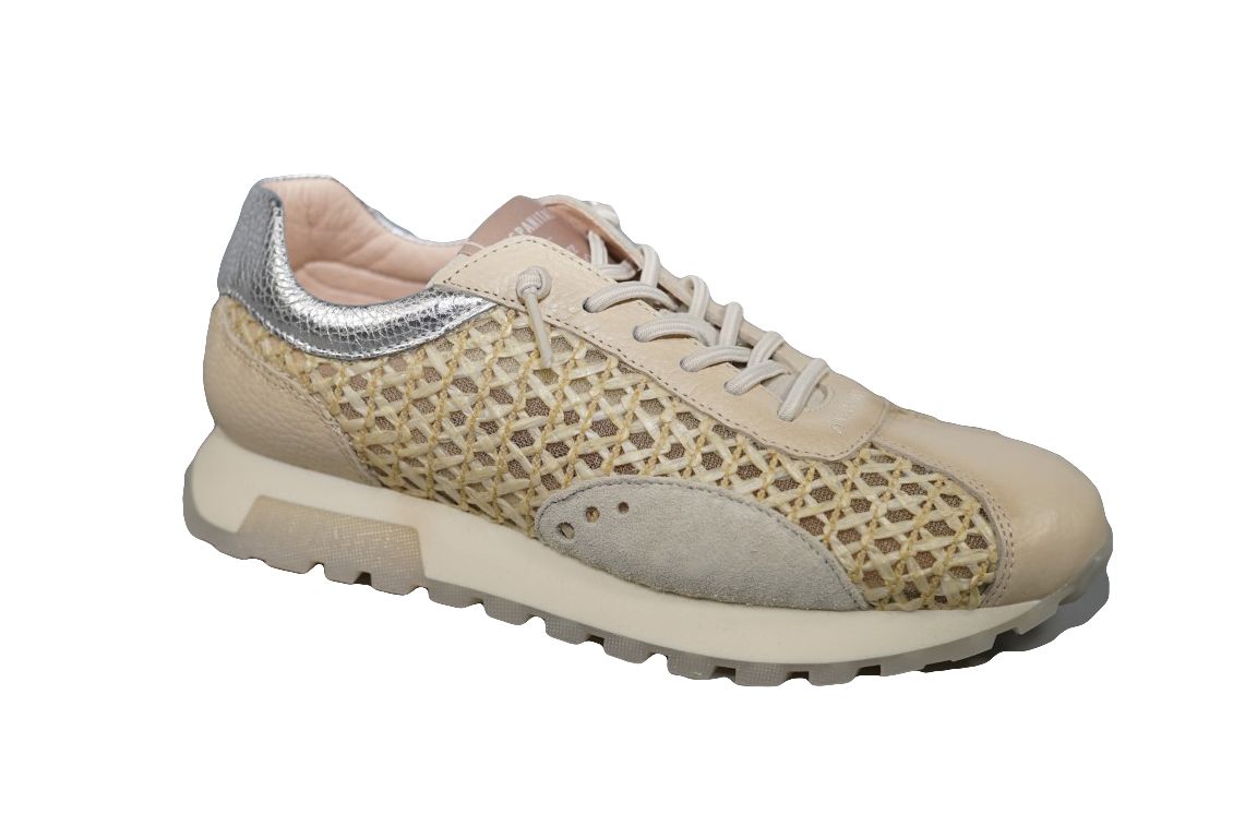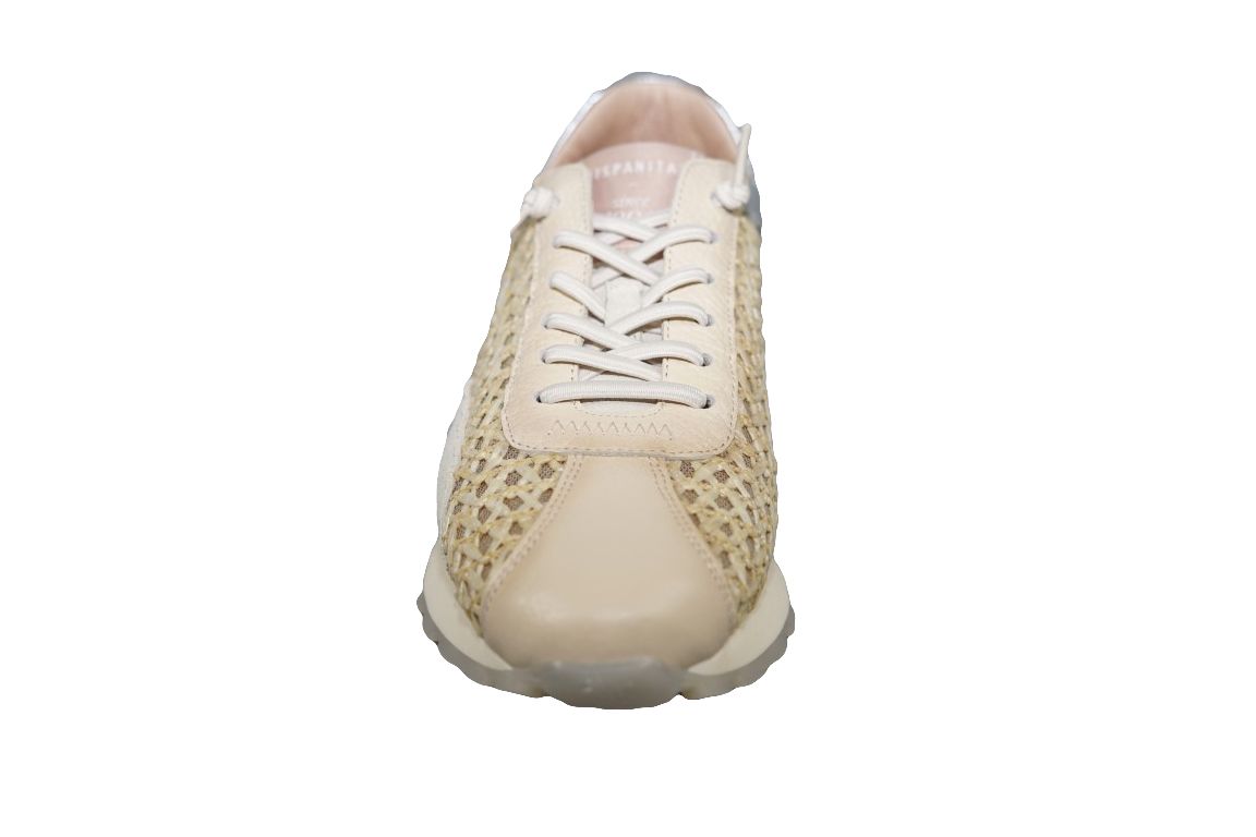 Sportieve sneaker van Hispantias in beige leer met alcantara vlecht combinatie.