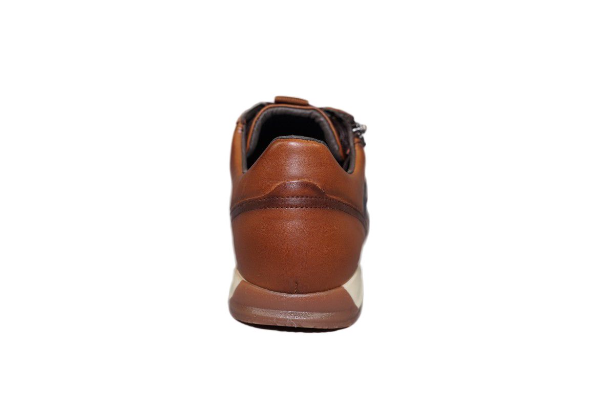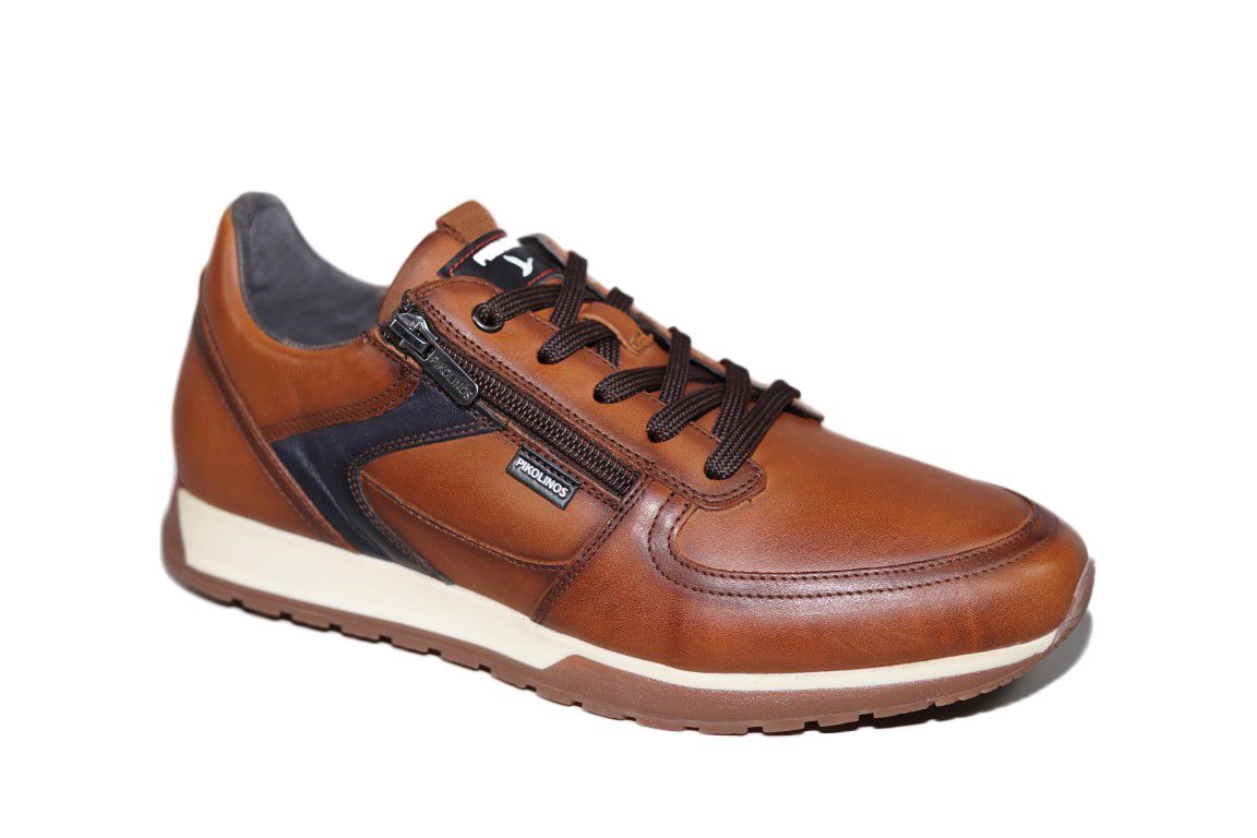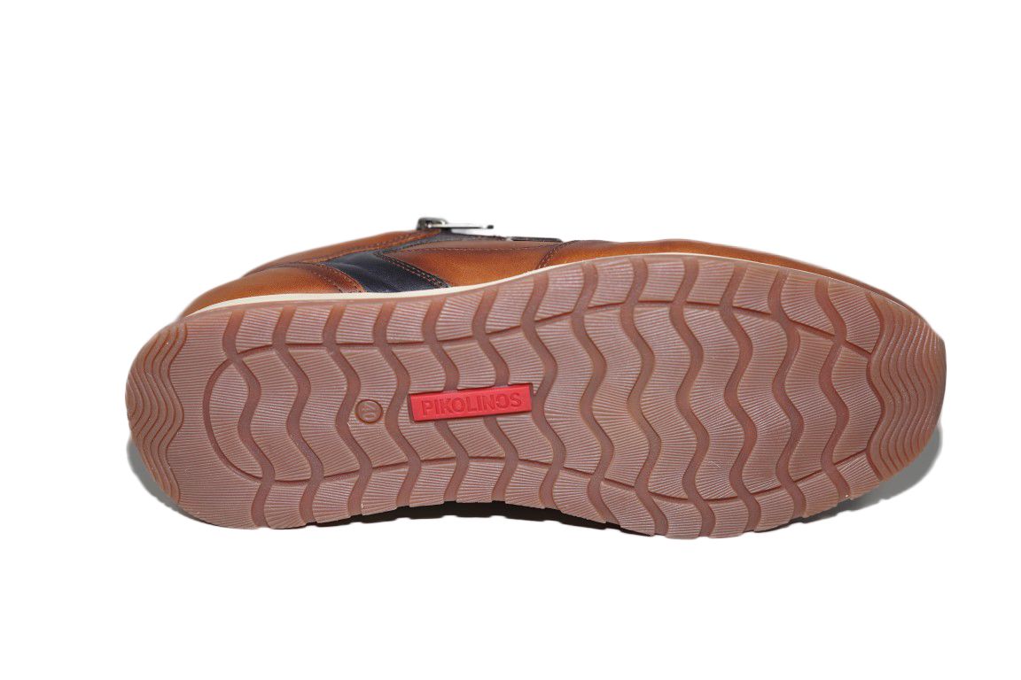Sportieve sneaker van Pikolinos in Cognac leer met blauw accent en handige rtis om in en uit te stappen.