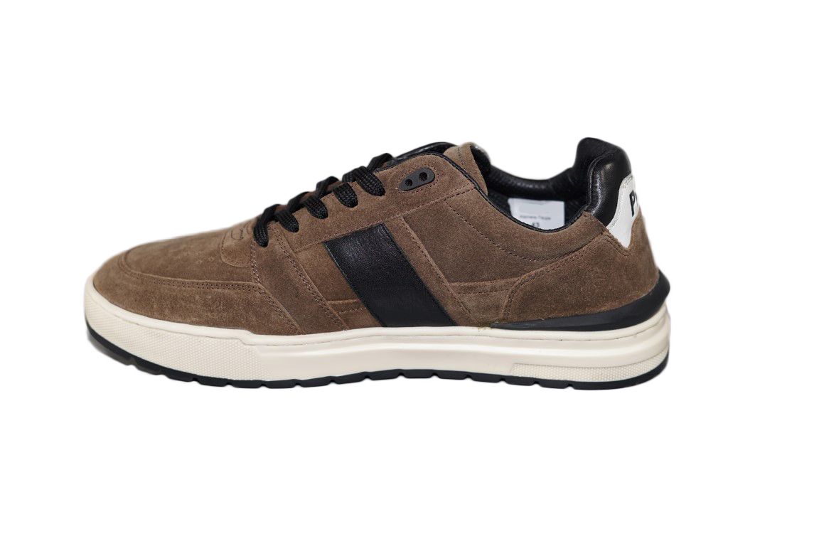 Mooie veterschoen van PME Legend in taupe suede met zwarte streep.