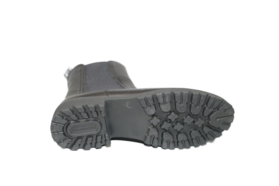 Stroere Chelsea boot van Remonte in zwart leer met elastiek en rits.