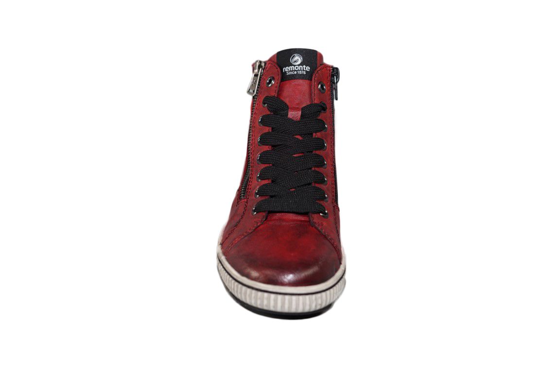 Sportieve veterboot van Remonte in rood leer met handige ritsen.