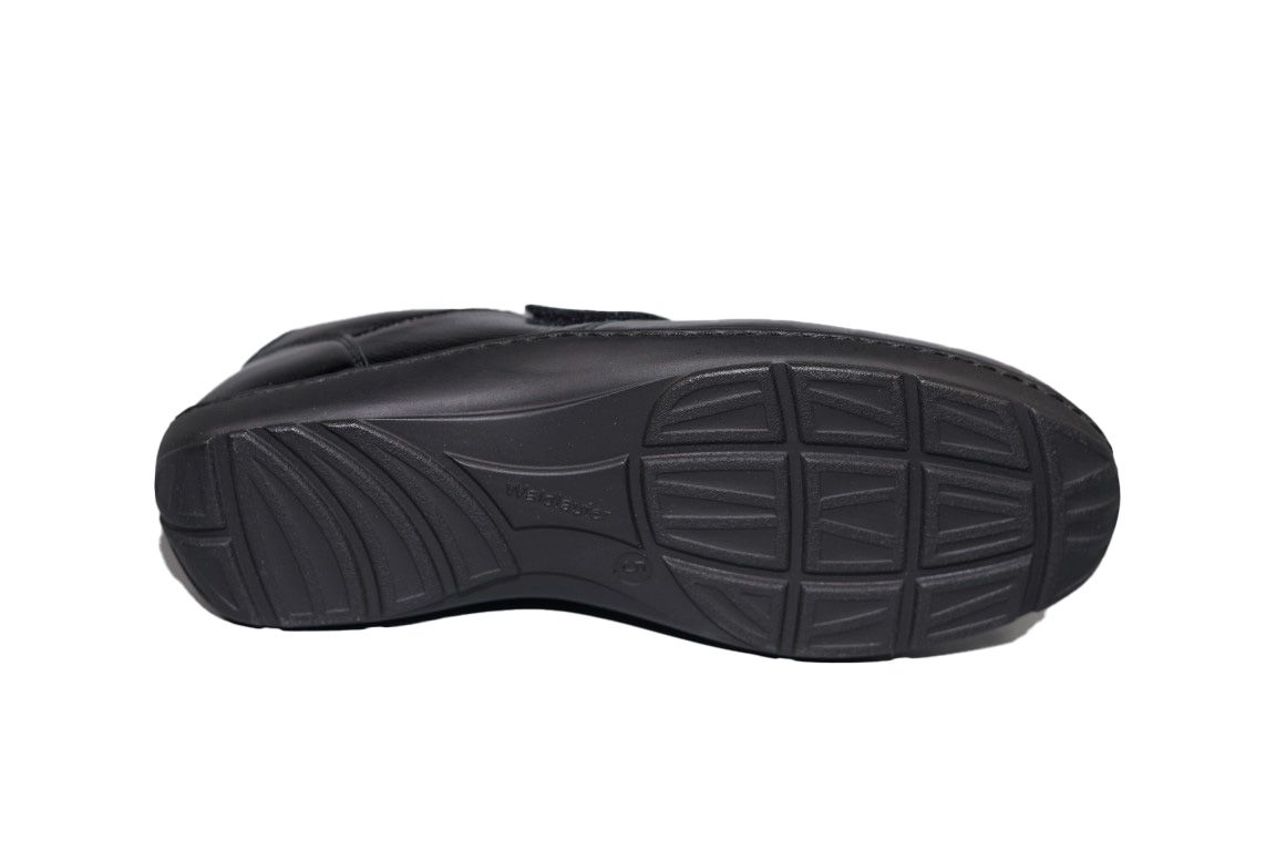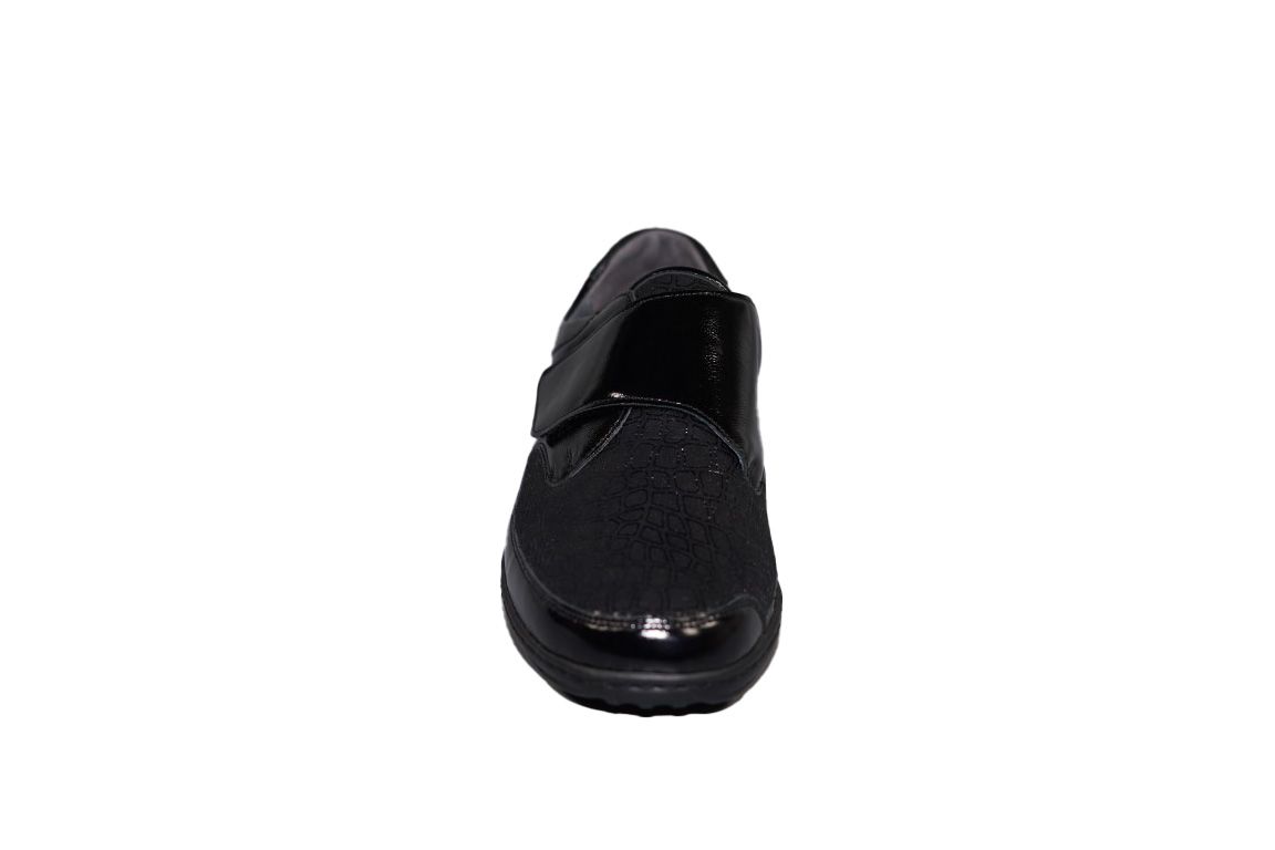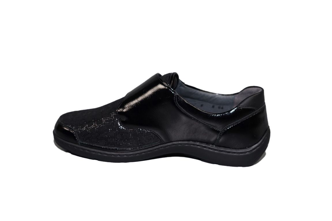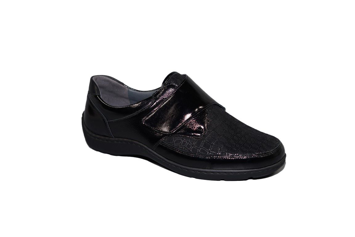 Soepele klittebandschoen van Waldlaufer in zwart lak leer met stretch combinatie.